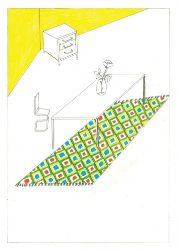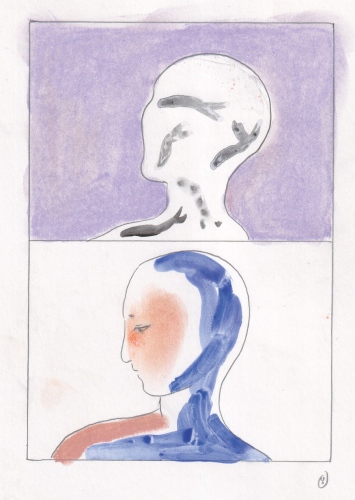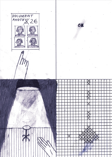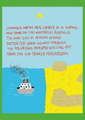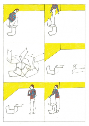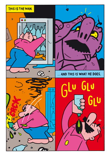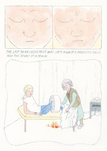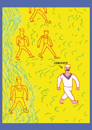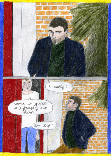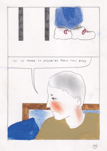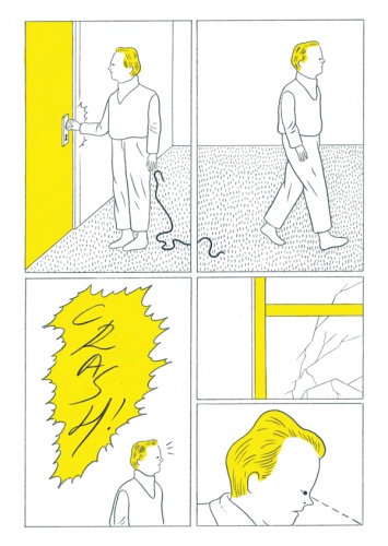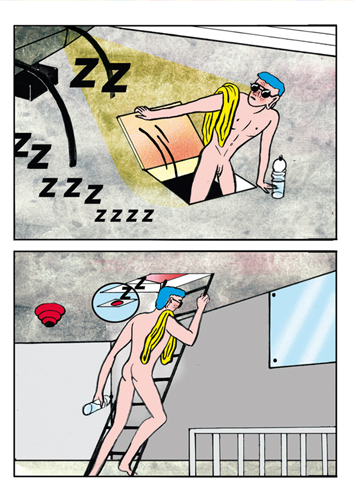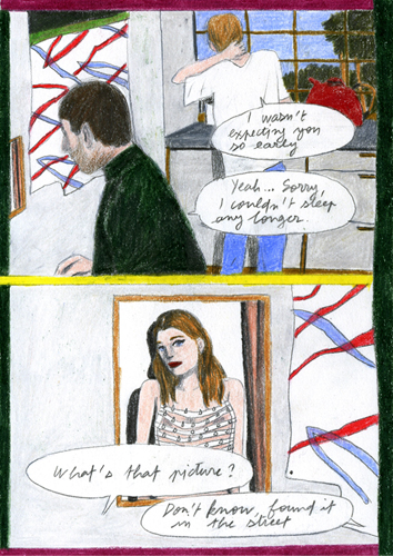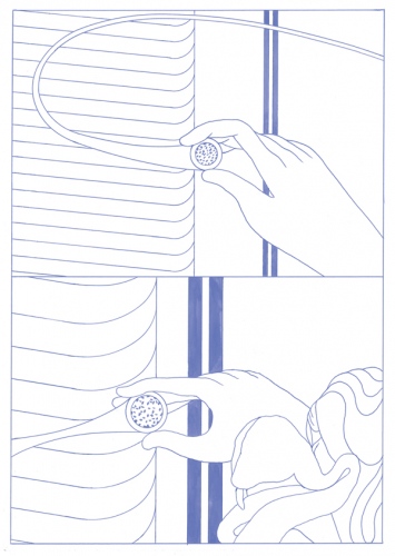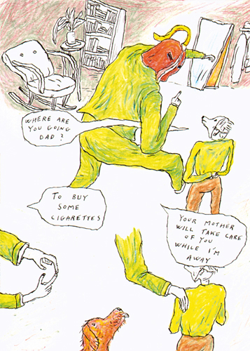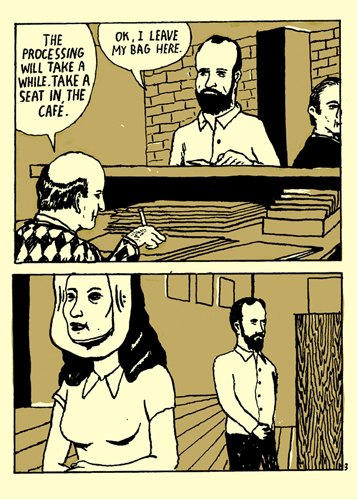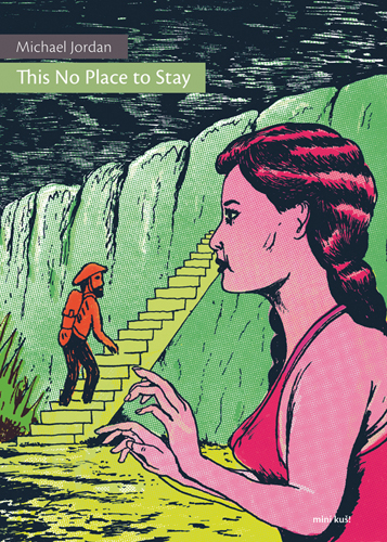 'This No Place to Stay' is a semi-fictional, semi-biographical story by the German artist Michael Jordan. His bearded alter ego travels through a coffee cup into a labyrinth inside a hospital laboratory. Hopefully the wound in the nurse's hand can rescue him...