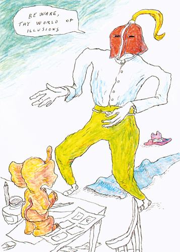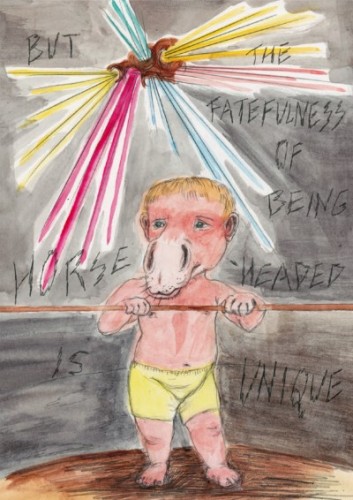 The story 'The Pernicious Kiss' by the Finnish poet and artist Tiina Lehikoinen is about a modern hero who has a horse head. He seeks love, but it's not easy to find a kissing-partner if you have a face like his…