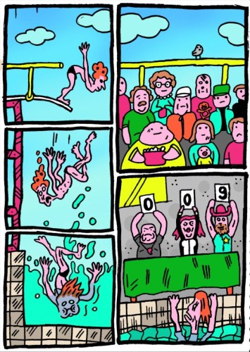 Anna Vaivare’s protagonist works at the Swimming Pool. She enjoys observing people while keeping herself almost invisible doing her work. When you least expect it she herself plunges into the water and unveils her special secret.