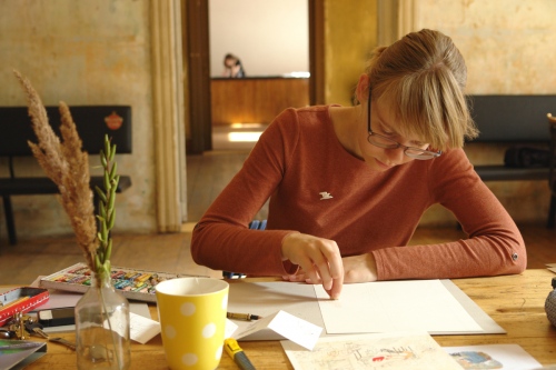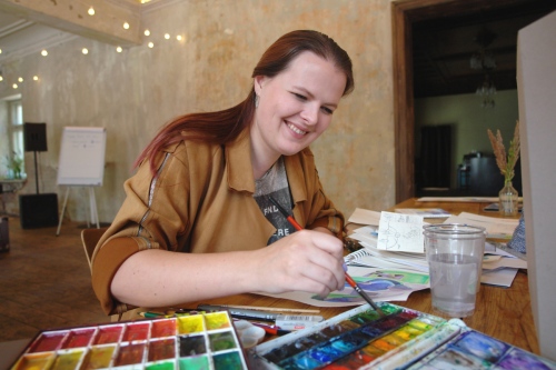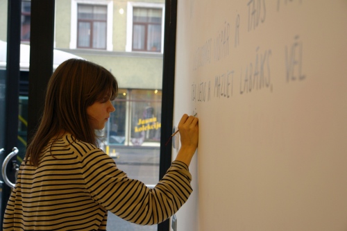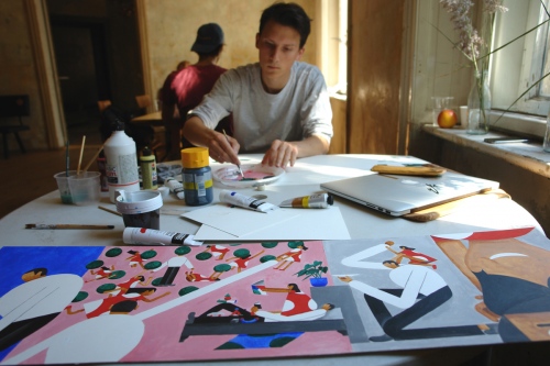 The Latvian painter and illustrator Lote Vilma Vītiņa spends a month in Marijas iela 13/1 creating art. Passersby can watch her work through the big windows. At the end of the residency, from 12.10-27.10, the results will be exhibited right there, so the passersby can see how they inspired new artworks.