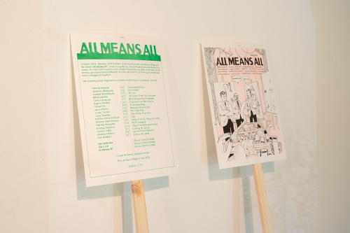 In March 2024, German artist Michael Jordan held a comic workshop in Riga with the theme 'All Means All'. Under his guidance, the participants discussed what this means for them and created comic posters inspired by the talks. In the end, all the comics got copied and distributed, and the participants cut them up to create new comic collages all together.